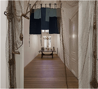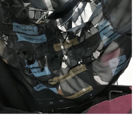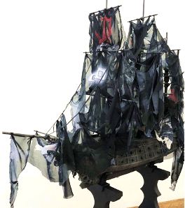 Separating rooms One and Two are sky blue curtains, a colour that projects both heavenly symbolism and serenity (Fig 1 & 3). The curtains are also reminiscent of the blue colouring of PrEP: the curtains serve as a reminder of the ritualistic qualities and worship of Room One, but also a promise of the STI endemics that precipitated medical advancement. Room Two – the control phase of the narrative arc – is filled with a natural light that works with the pieces to project impressions of hope and purity. SS Delirium (Fig. 3) appears to float in the centre of the room. This is the first of a three-part series of ships that describe Fujiwara’s personal journey with syphilis. SS Delirium is a reference to the voyages of Christopher Columbus to the New World, where it is posited that syphilis was contracted before being brought back to Europe. Columbus’s voyage is celebrated for his discovery, but the colonialising and economic motivations are referenced in the piece’s decoration, with reference to Lloyds bank, Visa, and the Coca-Cola company on the ship’s sails: commercialism drove Columbus and maintains a controlling grip on modern society. These appear alongside a washed rainbow motif that alludes to the LGBTQ+ community, and the slogan, ‘WE BOTH TAKE PrEP: WHAT’S YOUR RULE?’.