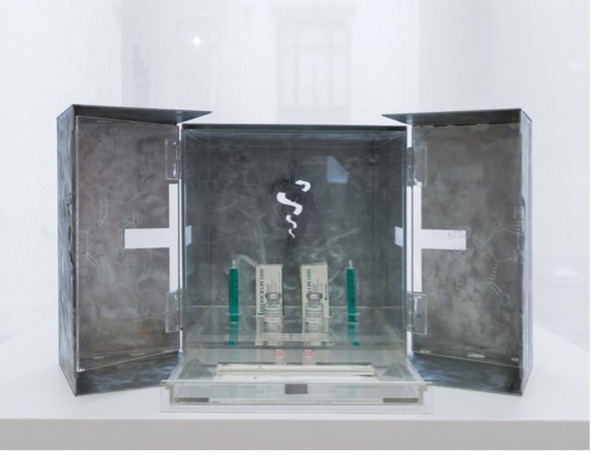 Figure 8: Simon Fujiwara, The Ark, metal plexiglass, the artist’ DNA and penicillin packaging, 60 x 80 x 130 cm, 2020