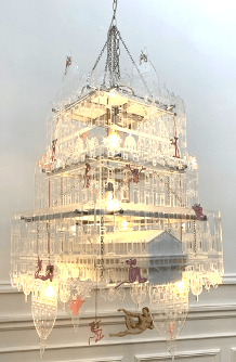Figure 5: Simon Fujiwara, Pink Panther vs The Pope, plexiglass, metal frame, chains, paper, light fittings, 68 x 68 x 150 cm, 2020