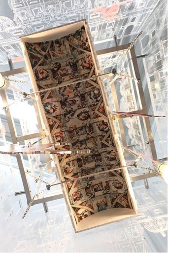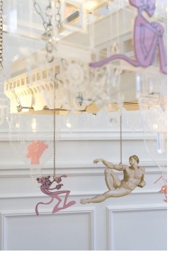 Pink Panther vs The Pope (Fig. 5) is the second piece in Room Two and appears as though a delicate, white chandelier, radiating with yellow light. The lowest hanging part of the chandelier is modelled on the Sistine Chapel. The interior is a scaled replica of Michelangelo’s famous fresco, whilst the exterior is adorned with images of the Pink Panther in what the artist describes as, ‘an epic takeover’. The dominant trimming of the chandelier is a parody of The Creation of Adam, where the image of God is replaced by an image of the Pink Panther. The piece references the societal control exerted by the Church in the 15th Century, but the insertion of popular culture results in iconoclastic imagery that treats religious control in the modern day with contempt. The piece begins a dialogue: does religion still hold the moral high ground on the subject of promiscuity?